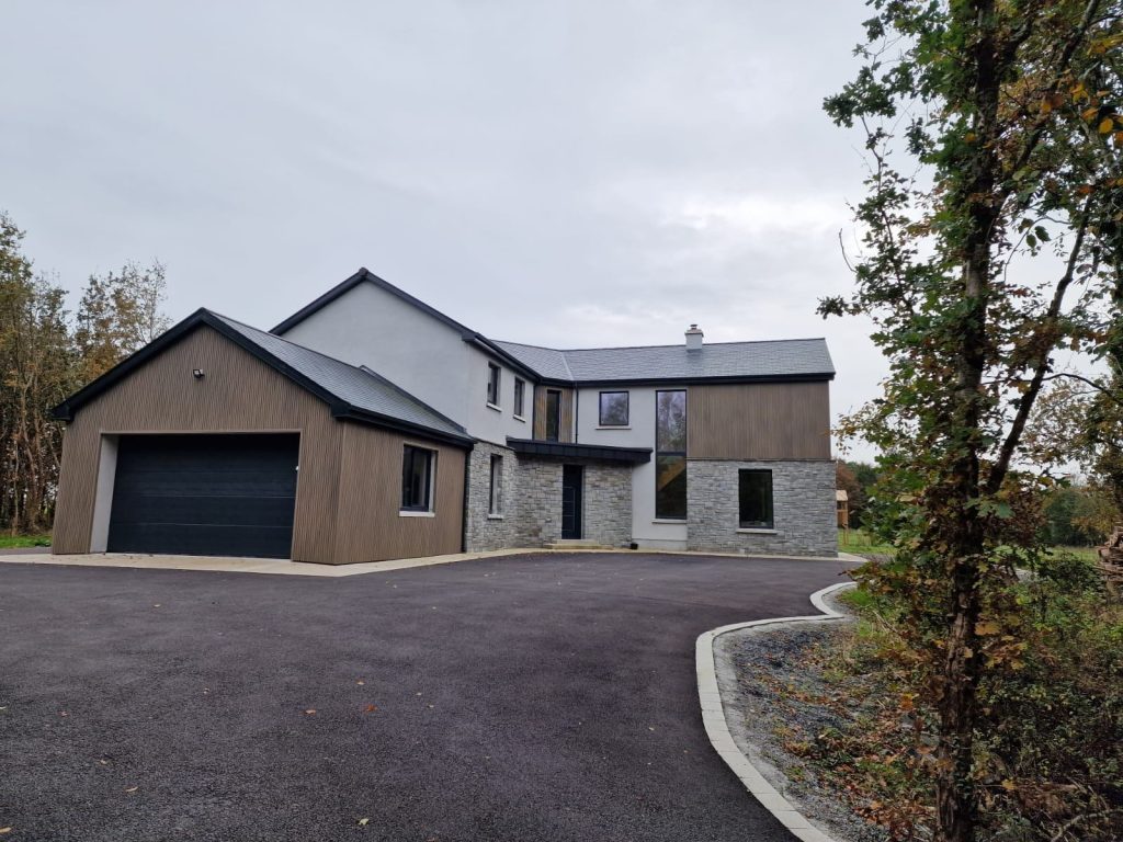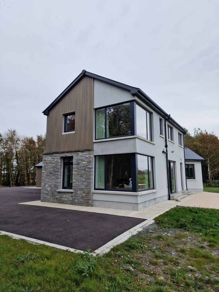 This modern new build showcases a perfect blend of modern design and traditional materials. Featuring a mix of natural stone, nautural slates, cedrail cladding, and render finishes, this A rated home achieves a stylish and contemporary look.
