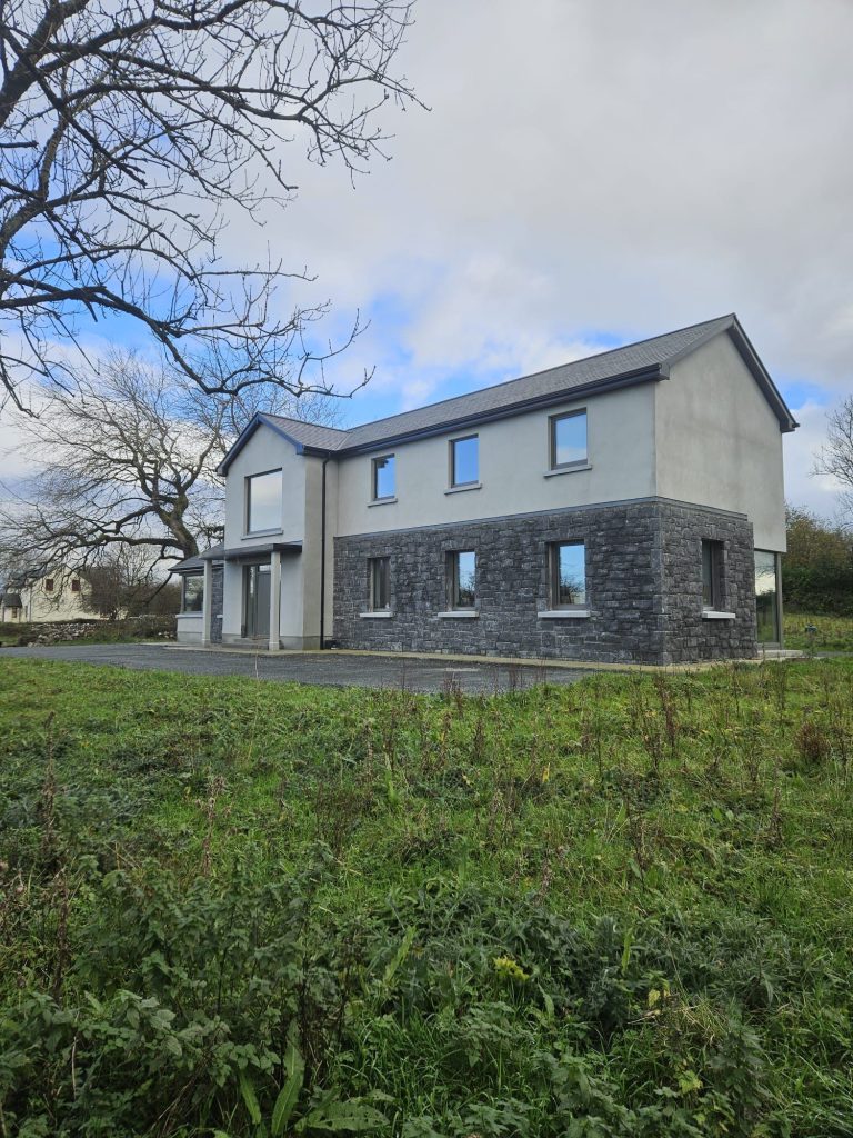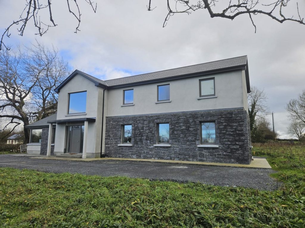 This newly completed A rated, two storey family home is finished to a high standard. The build includes a mix of rendered walls, natural stone achieving a modern balanced look. This eneregy efficient home includes triple glazed windows and doors, a corner feature window, with a turn key finish for our client.